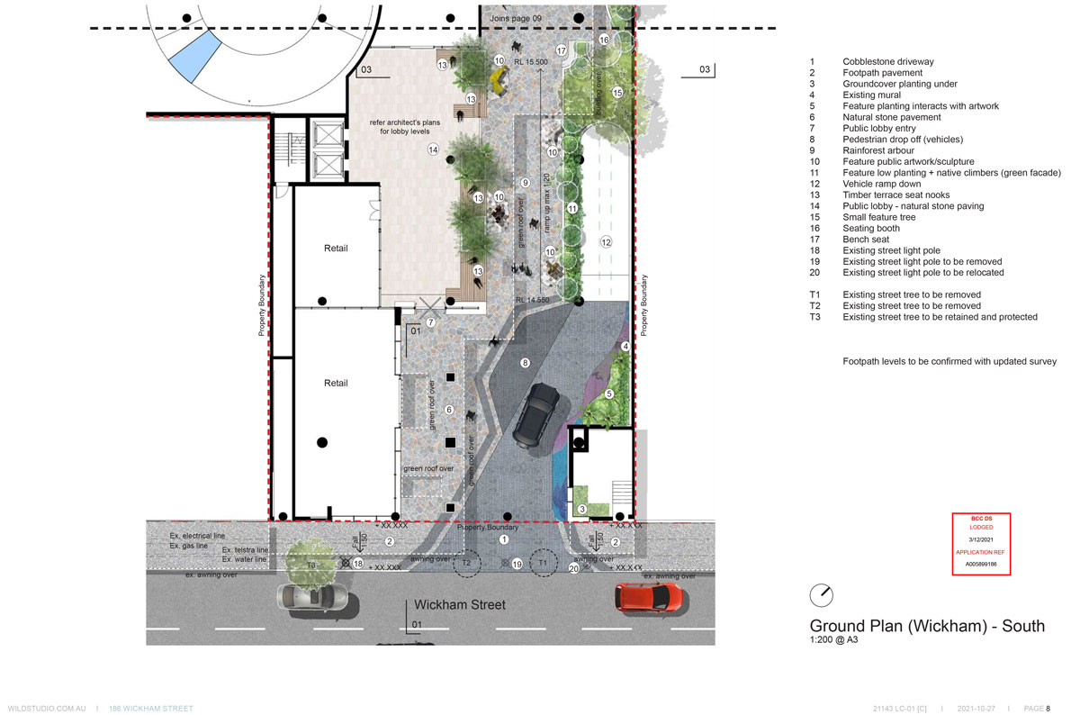 The tower has been designed so that it is elevated above the ground plane in order to enable an expansive landscaped public realm below, activating a planned through-link and providing a laneway experience from Wickham Street to Ranwell Lane. The lane would be activated by retail, a lobby space and landscaping.