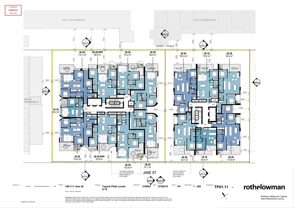 Known in the development application as ‘Jane Street’, the building is formed by one level of basement car parking, a two to three storey podium, nine to ten storeys of residential units and an unroofed and unenclosed communal recreation area at the roof level of each tower.