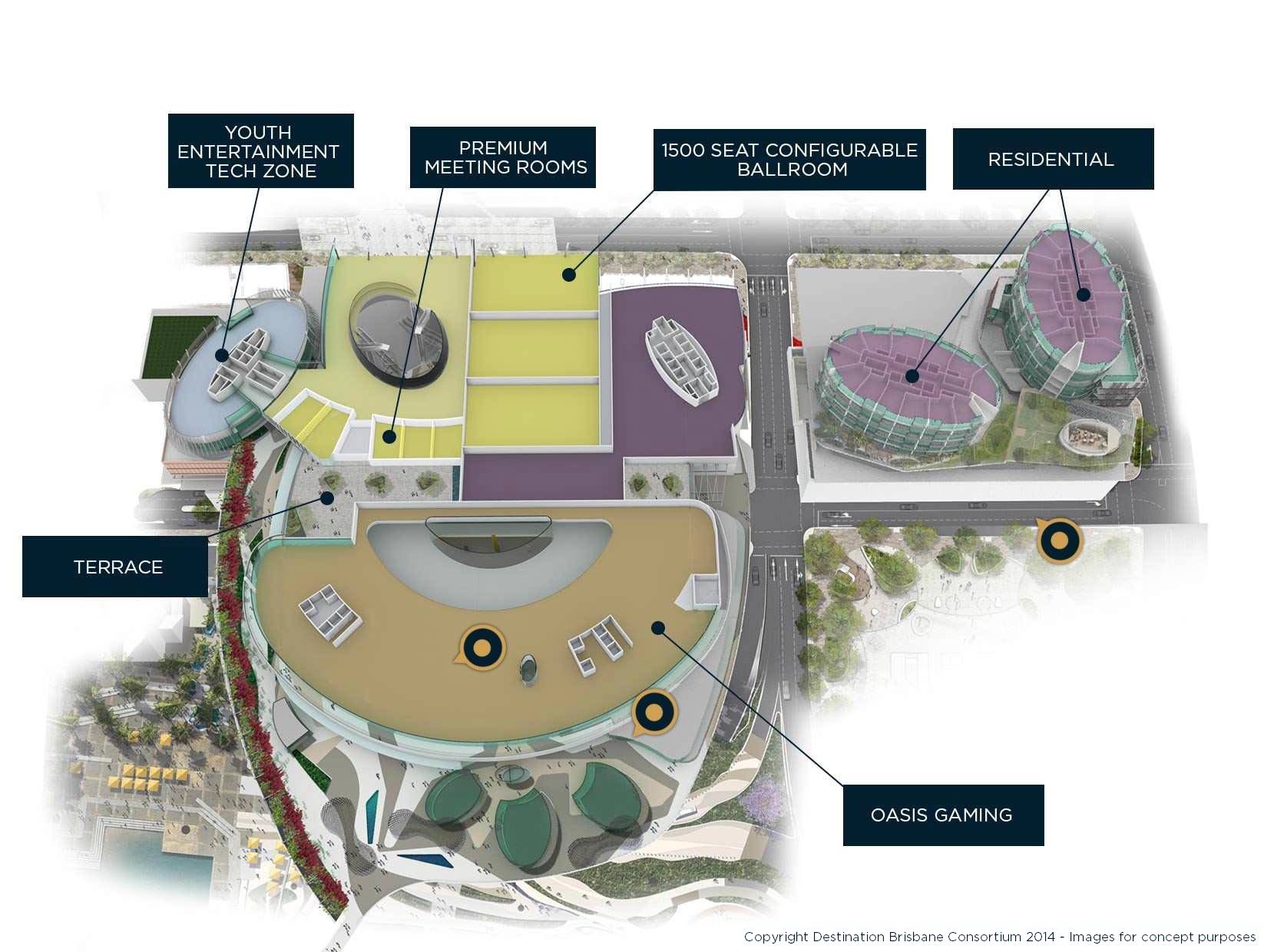 - Youth entertainment tech zone, 1500 seat ballroom, terrace, meeting rooms, gaming halls