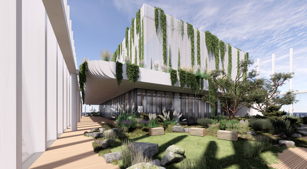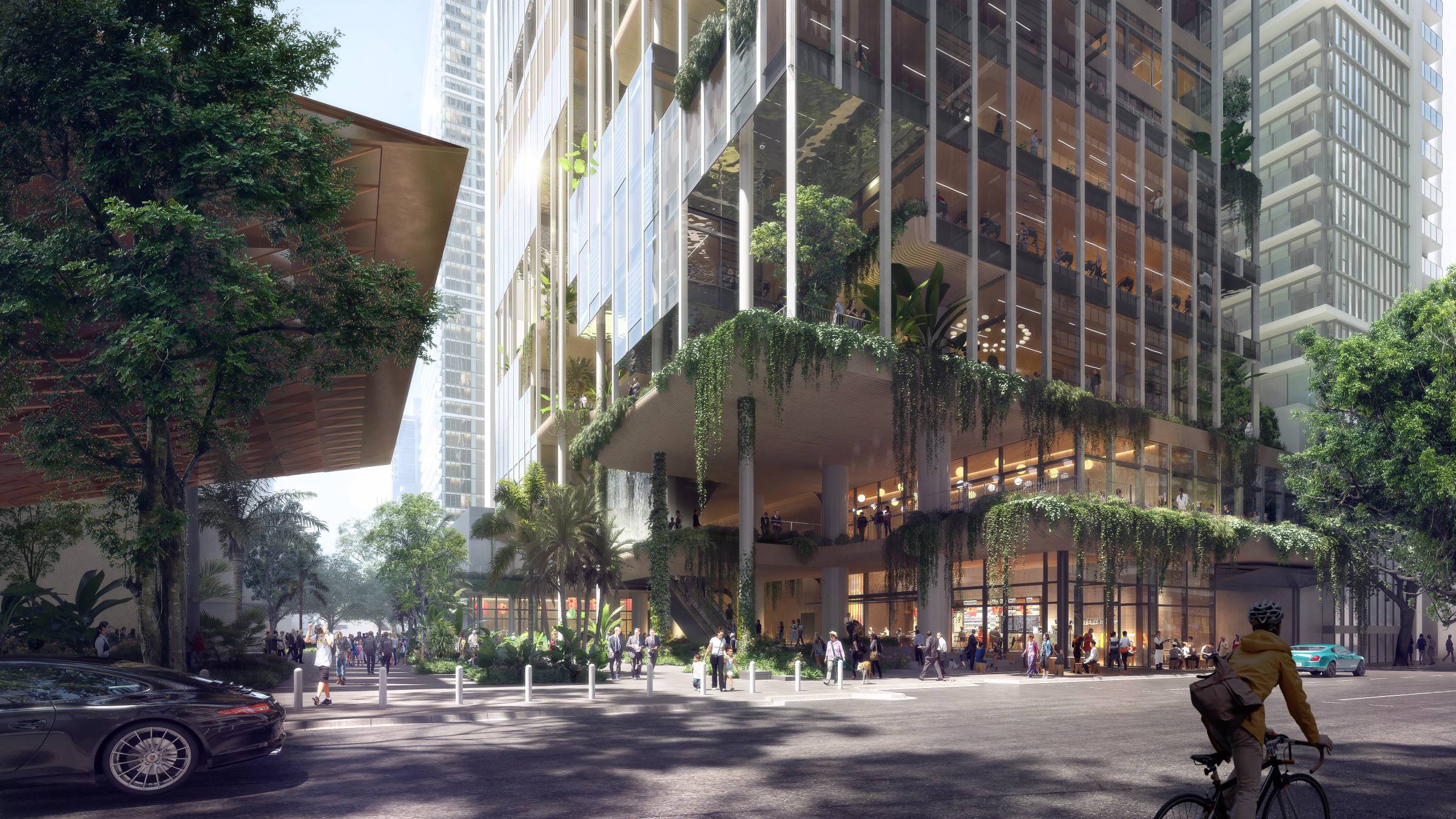 The tower’s design, led by architecture firms Architectus and Henning Larsen draws heavily on subtropical design principles, with deep shading, planting integrated into facades, and cross ventilated terraces designed to break down the scale of the podium and improve thermal performance.