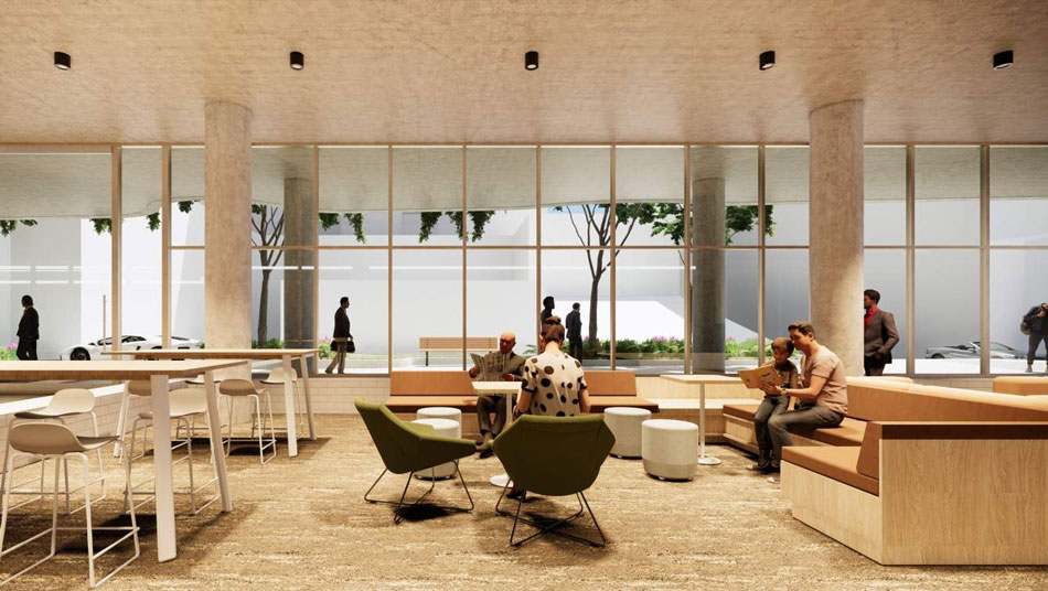 The use of concrete, glass, and bronze metal on the ground level are intended to create a strong base while maintaining a level of transparency with aesthetic details. Concrete, landscaping, bronze perforated sheet metal, and breezeblocks create a singular banded façade language to the podium levels along the three street frontages.