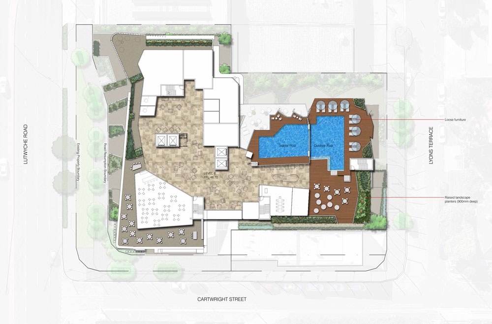 Level 8 – Community facilities, including Function room, bar, indoor lounge, outdoor lounge, café, private kitchen/dining facility, wellness facilities (gym, studio, day spa, consulting rooms, indoor and outdoor pools) and landscaped outdoor areas.