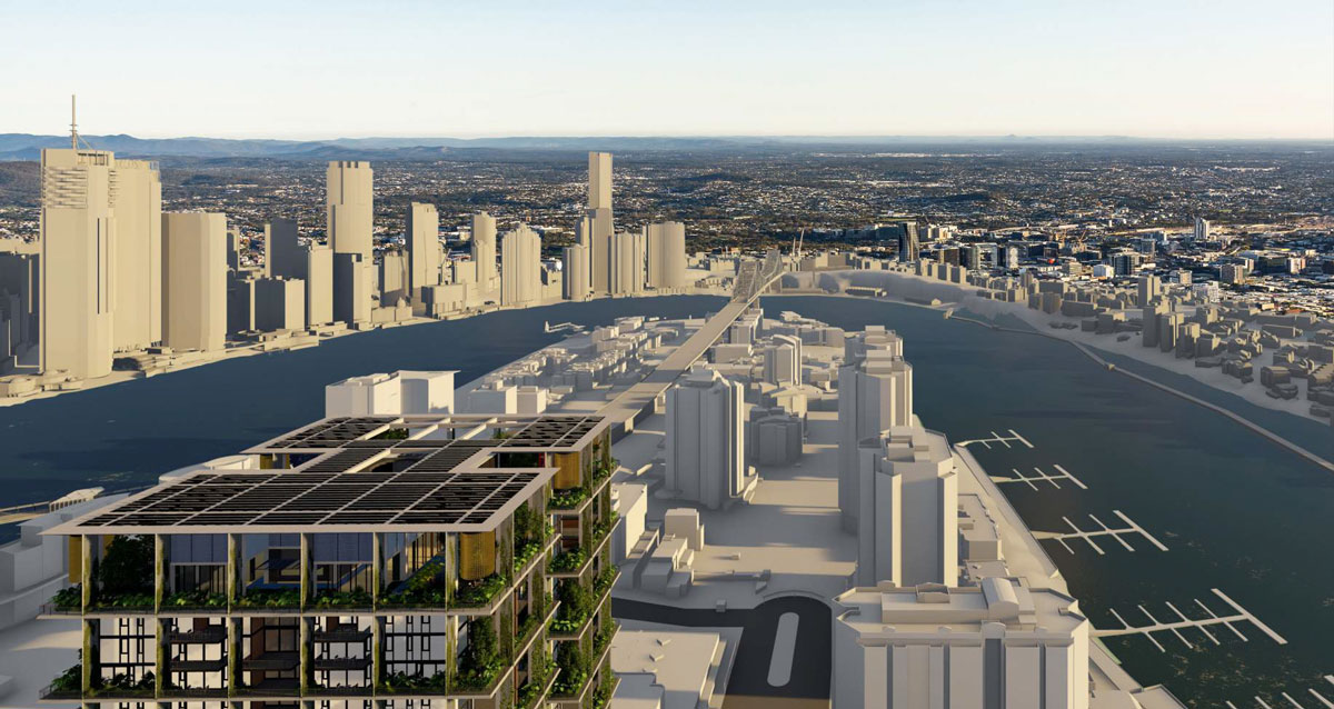 Designed by Brisbane-based Architectus and Singapore-based WOHA, the proposal has emerged for the redevelopment of an old dry dock site in Kangaroo Point, featuring a towering structure that appears to “float” atop 20-metre stilts.