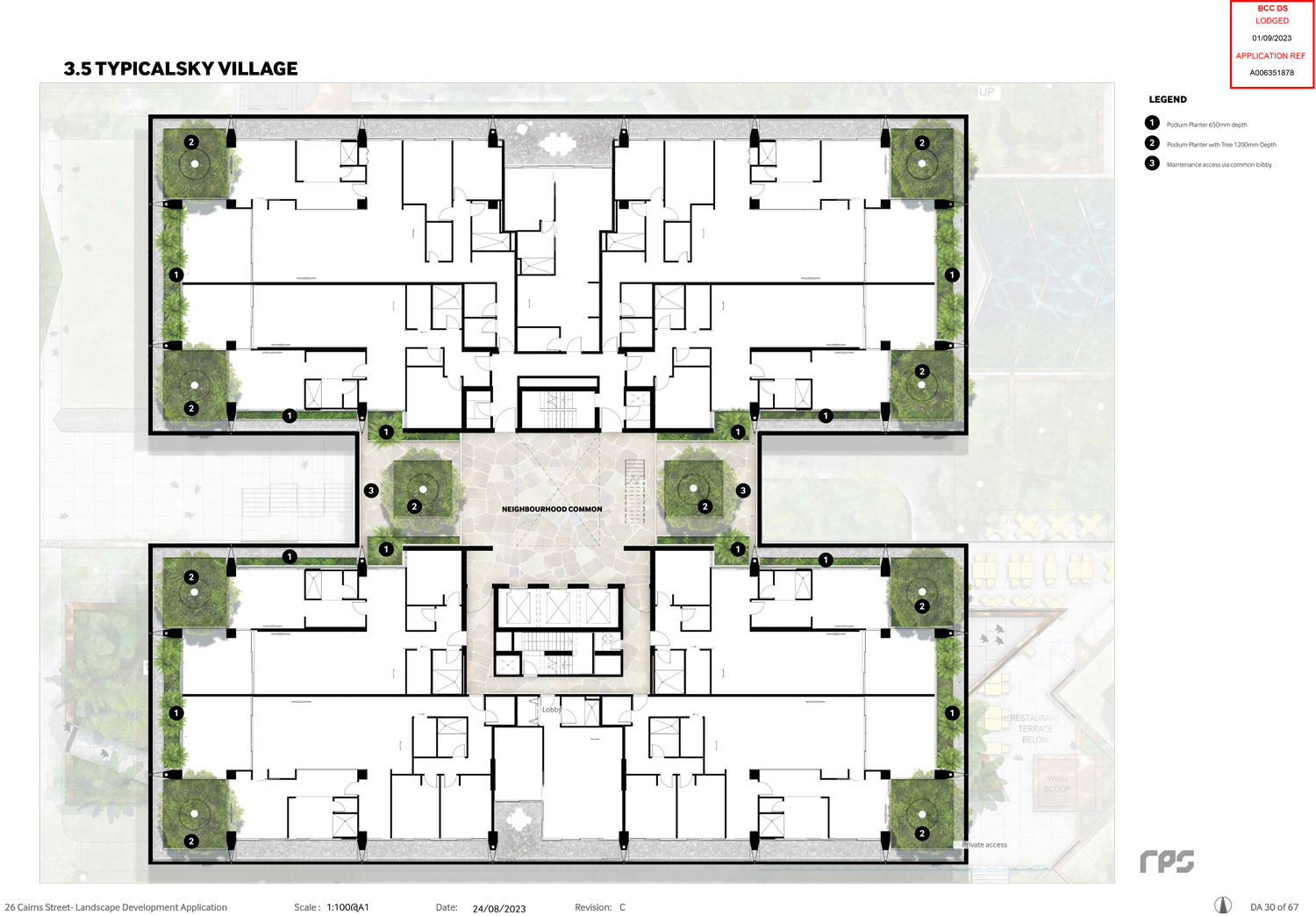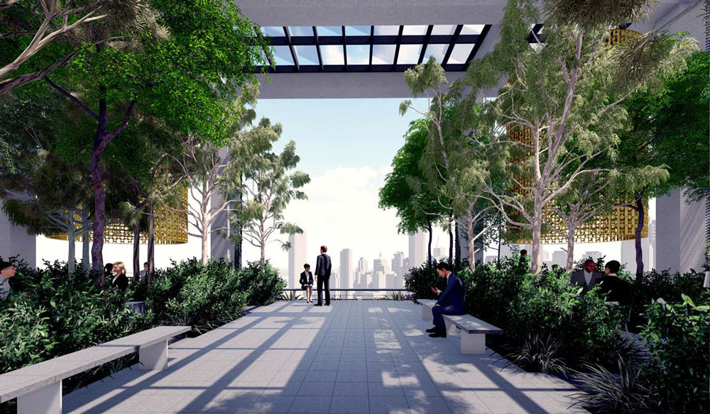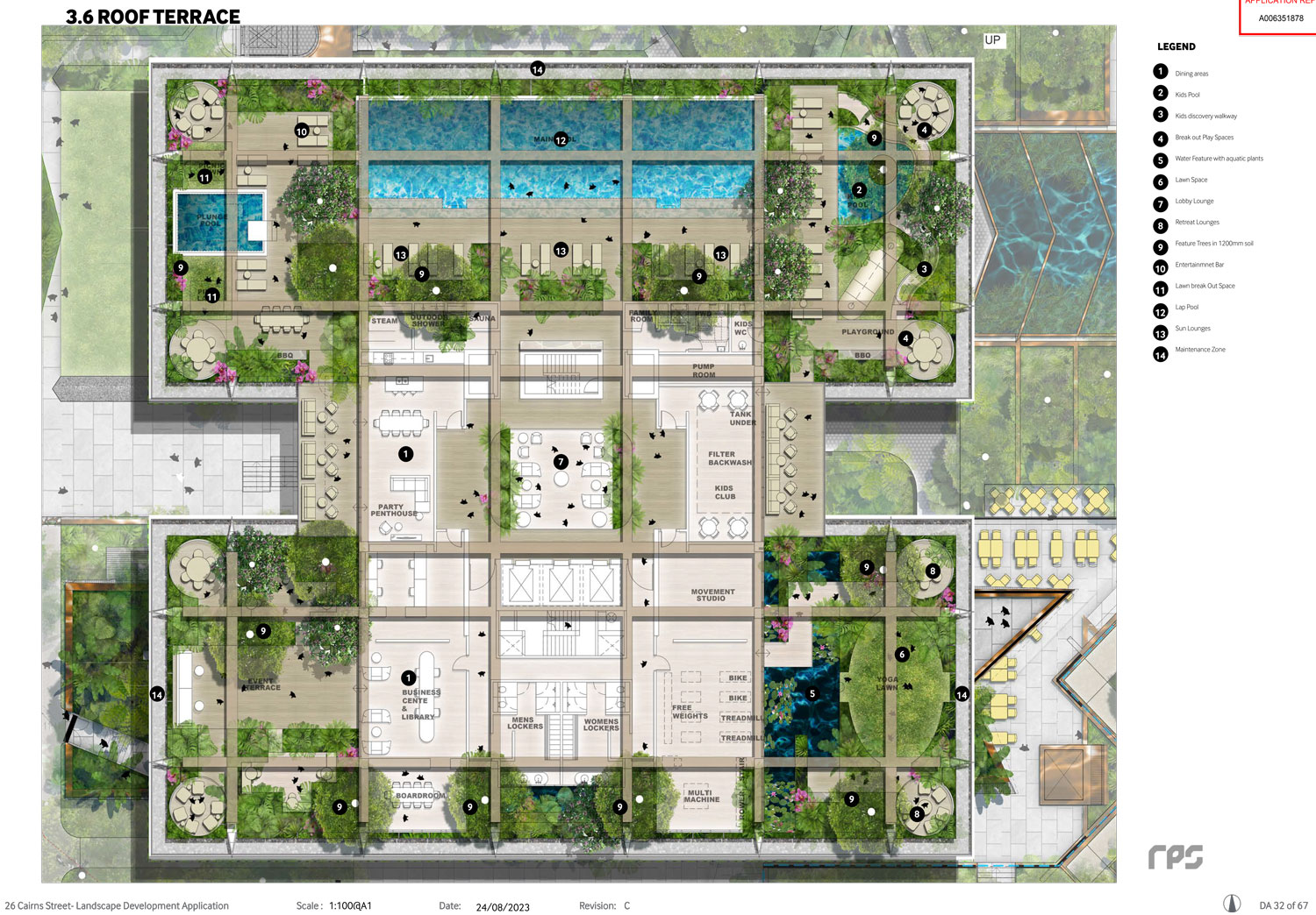 Communal recreational amenities are proposed on the roof level, which are divided into five distinct spaces through landscaping treatment.