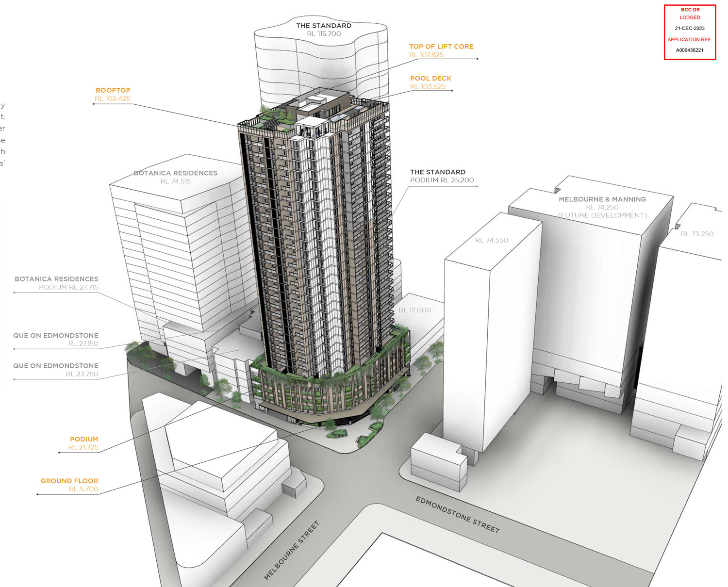 According to the development application, a 132m2 commercial tenancy on the ground floor will provide active frontage parallel to Melbourne Street pedestrian stair entrance is via the south of the building, on the corner of Melbourne Street and Edmondstone Street.
