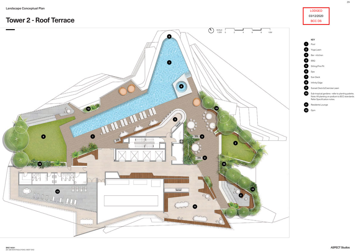 Tower 2 rooftop features a function room and business lounge on ground and a recreation deck with gardens, pool, BBQ facilities, gym, lounge, sky dining and bar on the roof terrace. There is also a small sitting terrace on the level 5 podium which doubles as access for servicing the large green wall on the east and the terraced planters on the north.