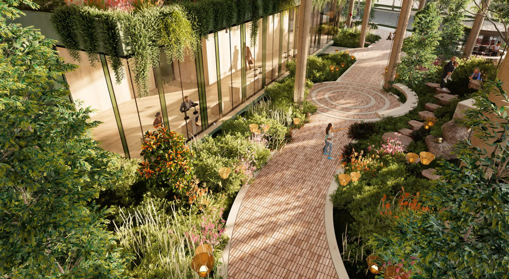 This landscaped space below the development plans to become an invitational, active, and publicly accessible place that links Bank St and Mollison St, visibly connected to the streetscape.
